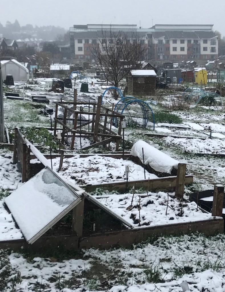 My frames are made (two caravan windows for one; wire hoops covered with fleece for another), but I’m short of manure heat. The perpetual cry of anguish from my neighbours is: “Where can I find manure?” There’s rumoured to be a load of composted restaurant kitchen waste being delivered by the local cycle cargo company. No sign yet.